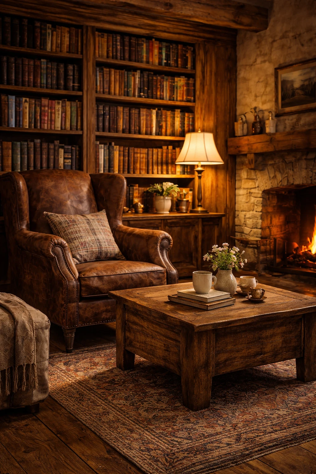A countryside living room often includes a quiet reading corner filled with books.
