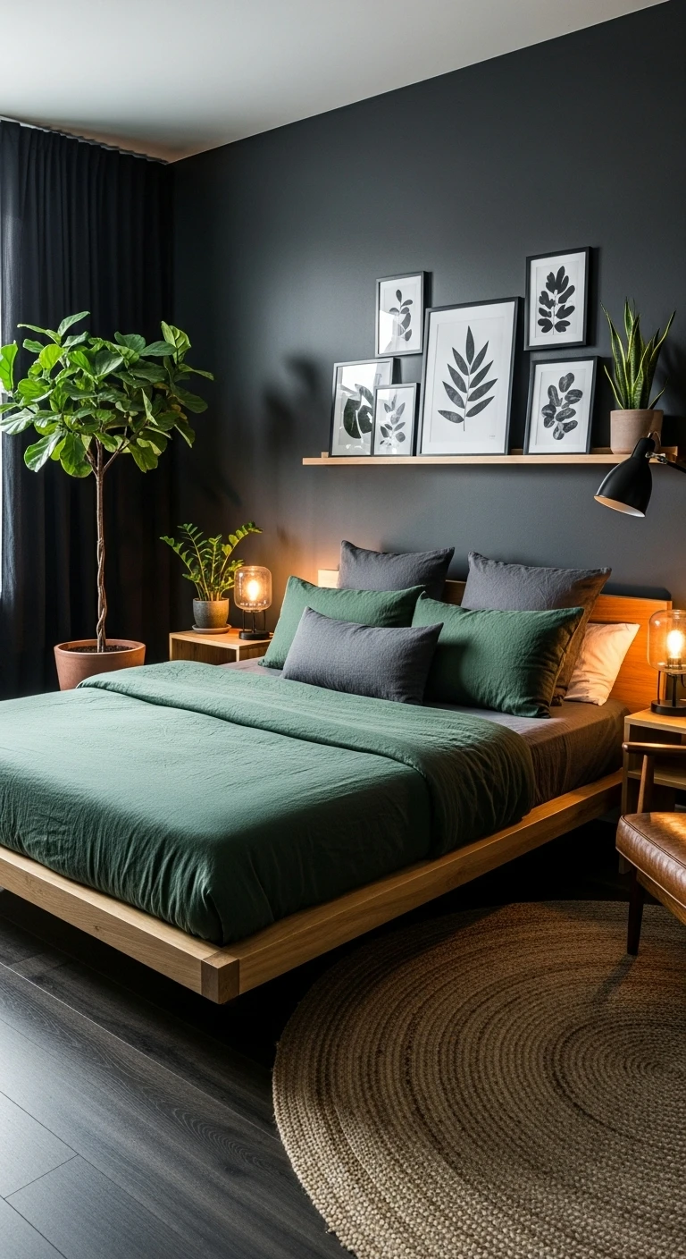 12. Black and Green Nature Inspired Bedroom