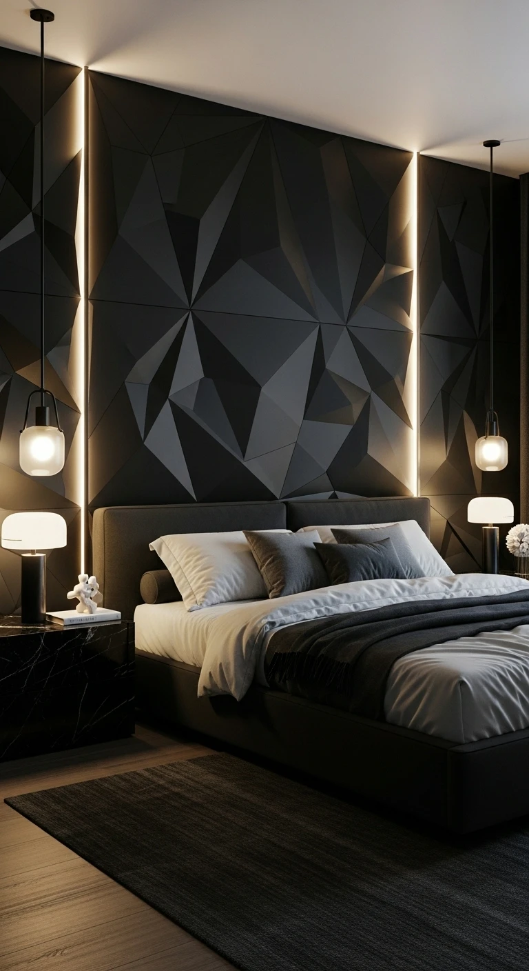 Black geometric wall panels behind the bed create depth and a high-end appearance without requiring expensive furniture.