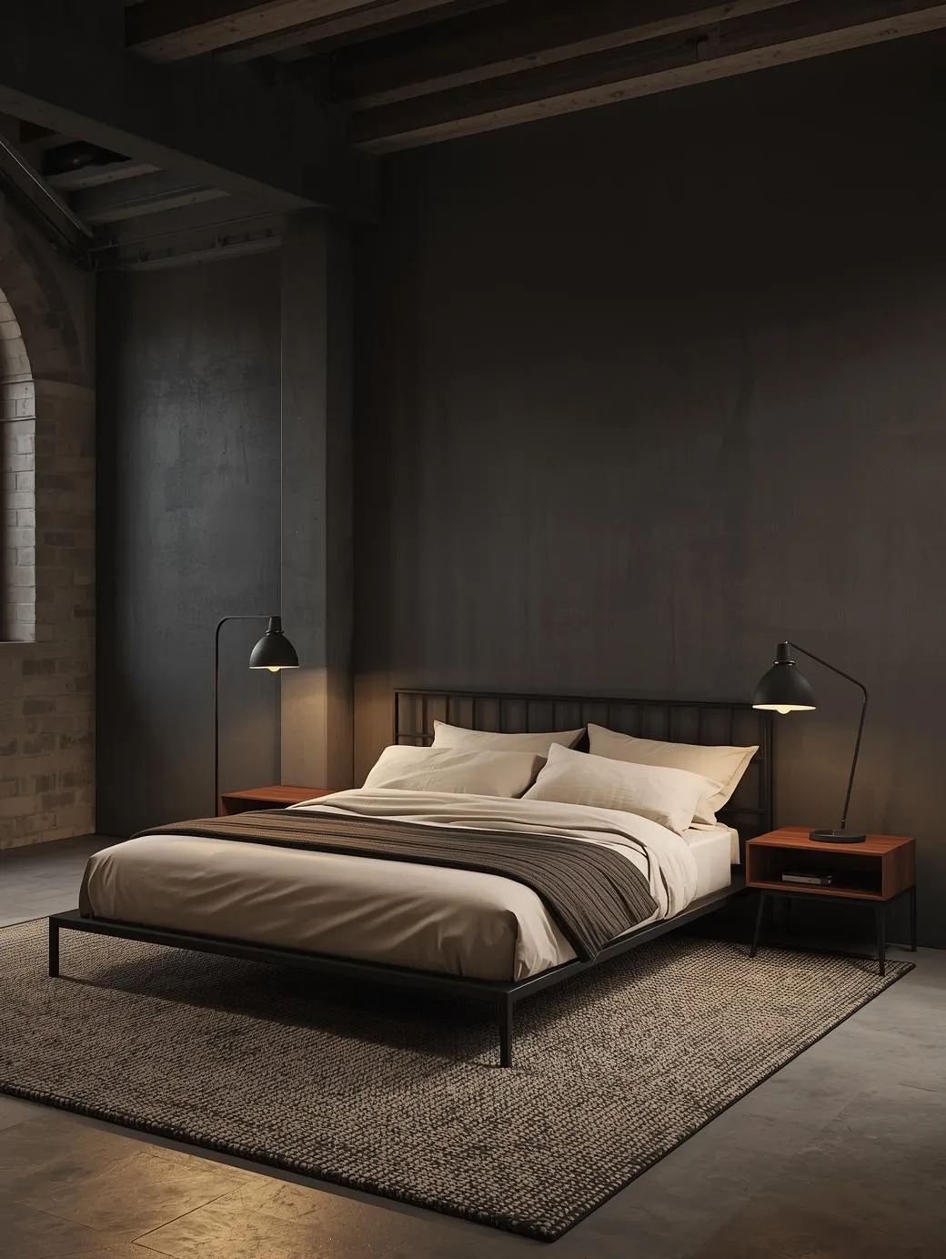 A neutral modern bedroom can feel grounded by introducing darker tones in a controlled way. In a converted industrial loft, charcoal plaster walls create depth while a black steel bed frame adds architectural structure. Layered cream bedding softens the contrast, and walnut nightstands introduce warmth through rich wood grain. Warm-toned table lamps balance the darker envelope of the room, aligning with the 2026 shift toward mood-driven lighting.